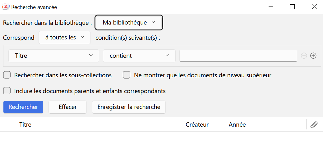 - Mise à jour automatique de cette collection (à chaque fois qu’une nouvelle référence correspondant aux critères de recherche est ajoutée dans Zotero, elle l’est également dans la collection dynamique).