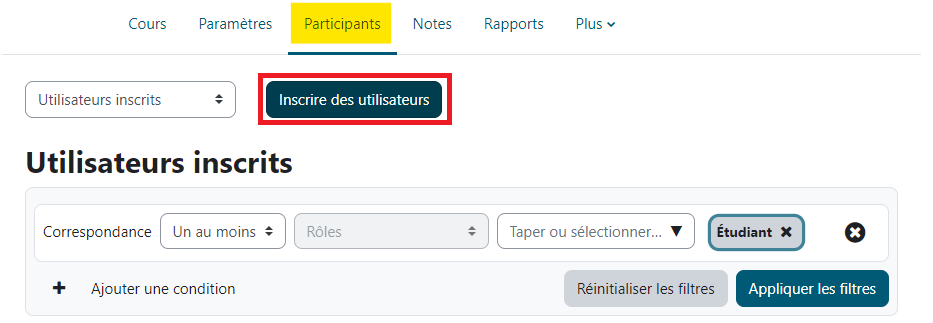 Dans le cours où vous souhaitez inscrire des utilisateurs cliquez sur l'onglet Participants. (ou le lien Participants pour l'interface classique)