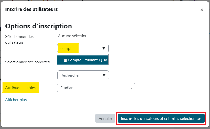 Sélectionner des cohortes : Si vous travaillez avec des cohortes, il est possible d'en ajouter ici en les recherchant dans le menu déroulant. Nous vous conseillons, par contre, d'utiliser la méthode de synchronisation de cohorte qui est plus adaptée et efficace pour les inscriptions par cohortes.