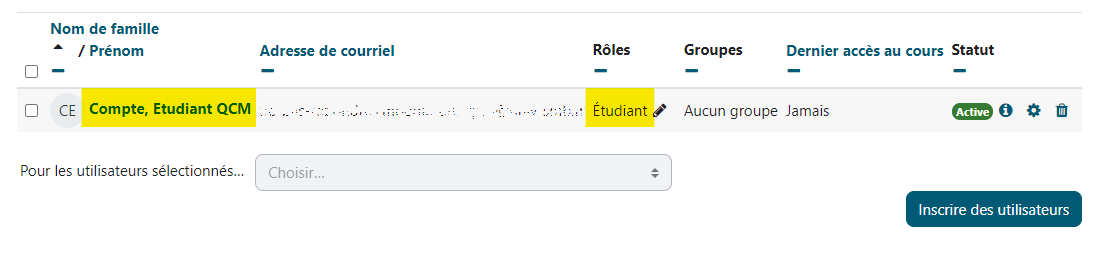 Après avoir inscrit un utilisateur, retournez sur la page des participants. Vous verrez maintenant une liste des utilisateurs inscrits dans votre cours. Pour chaque utilisateur, vous pouvez vérifier :