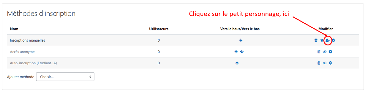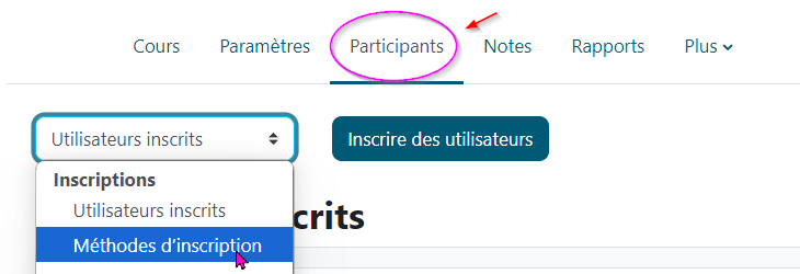 Les méthodes d'inscriptions se trouvent sous l'onglet Participants dans la liste déroulante à gauche de l'écran :